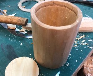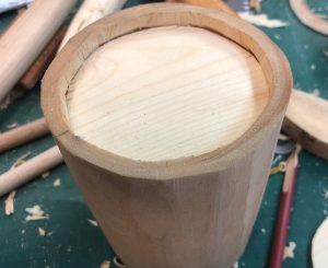 シュリンクポット作りとなるとこれにさらに生木から段々乾燥材になるにつれて収縮すると言う現象を利用する。 円筒を削り出し下の方に水平に溝を掘り乾燥材の底板を丁度のサイズに削って嵌め乾燥(収縮)を待つという方法だ。