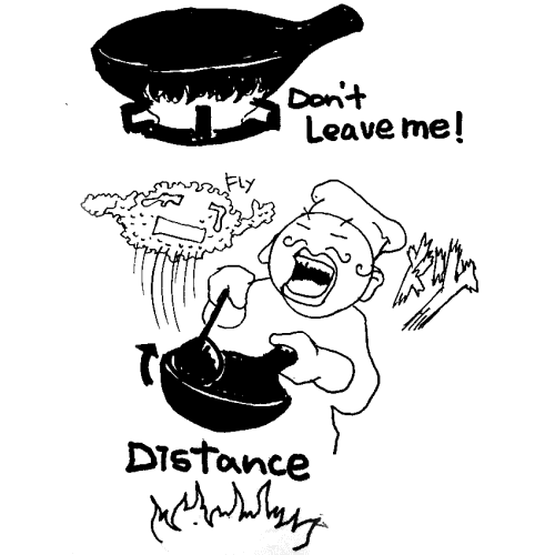 バーナーのゴトクから鍋を離さぬよう、鍋を握った手を前後に、