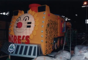 伝統的な物ではないので人力で移動ではなく10t車や4t車をベースに木材や発泡スチロールでオブジェ化していく。